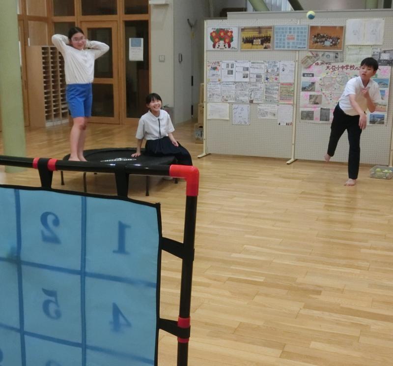 児童生徒のみなさんは、昼休みを思い思いに満喫しています。ストラックアウトをする人。トランポリンをする人。それを応援する人。みんな仲良しです。