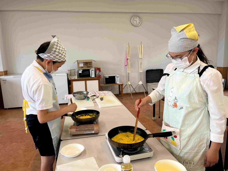 6年生が調理実習を行いました。作ったのは、野菜炒めとスクランブルエッグです。材料の切り方や炒める時の火加減,加熱時間などを工夫して調理をしました。