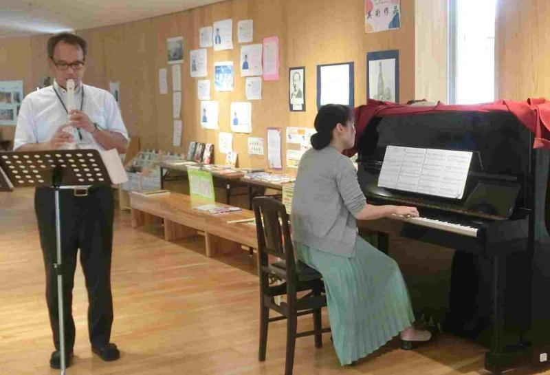 昼休みに三崎中学校から週1日後期課程の音楽の授業に来られている下道先生と前期課程の大澤先生によるミニコンサートが行われました。ピアノとリコーダーのアンサンブル曲やピアノとトライアングルのアンサンブル曲を演奏してくれました。ピタゴラスイッチの曲や新時代、ドラえもん、人生のメリーゴーランドなどなじみのある曲を演奏され、児童生徒の皆さんはその音色に聞き入っていました。「人生のメリーゴーランドが好きです。演奏がすごかったです。」「ミスが少なく演奏の完成度が高かったので、すごいなと思いました。」という感想が聞かれました。次回も楽しみにしたいですね。