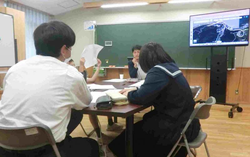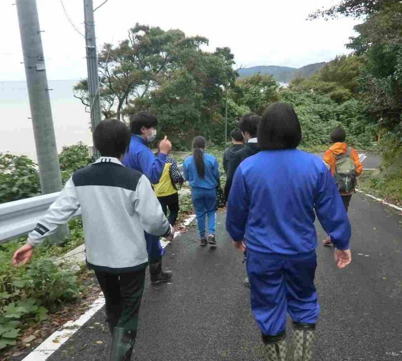 地域の方に講師をしていただき、防災学習会を行いました。地震・豪雨という災害に見舞われました。その経験を踏まえ、自分の命を守る行動をするために、自分たちで防災マップを作ることを目標に行いました。実際にフィールドワークをすることで、地区の危険個所を知ることができました。地形が変わってしまった個所もあり「水の力はすごいな。」「こんなところが壊されていたんだ。危ないな。」などの気づきがありました。