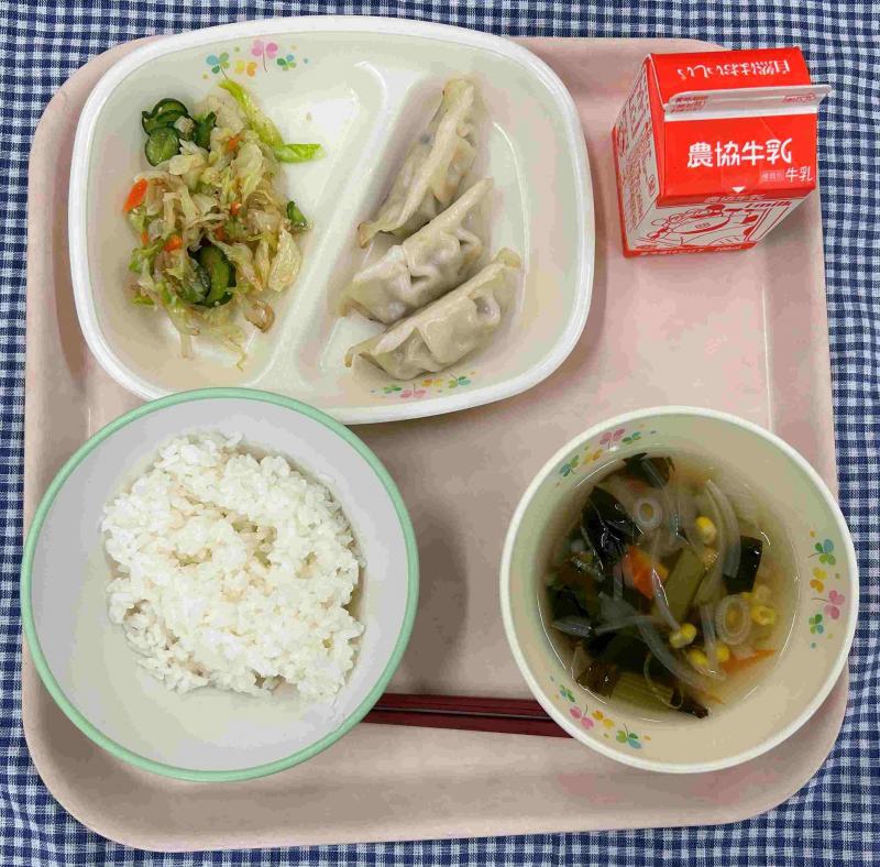 今日の献立は、白ごはん・ぎょうざ・キャベツともやしのナムル・小松菜とコーンの中華スープ・牛乳でした。