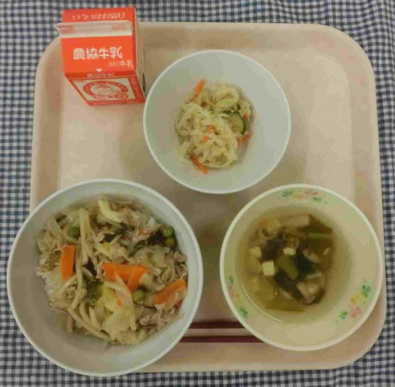 今日の給食献立は、中華丼・切り干し大根の中華サラダ・小松菜の中華スープ・牛乳です。