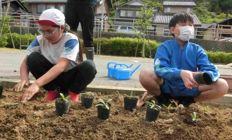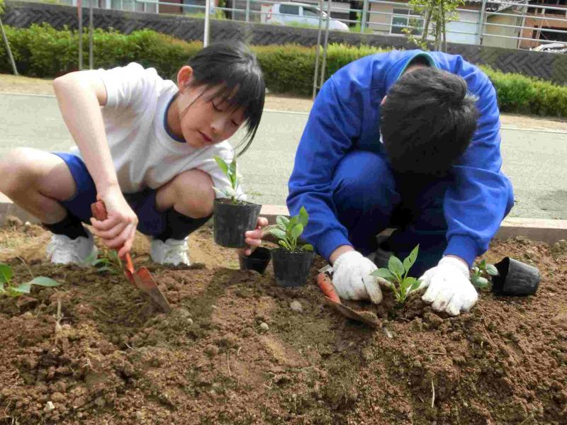 みんなで、地域の方からいただいたきゅうりと花の苗を植えました。草むしりをし、畝を作り、一つ一つ丁寧に植えました。6年生が最後に「おおきくな~れ」と言いながら水をかけてくれました。これからもきちんとお世話をして、大きく育ってほしいですね。