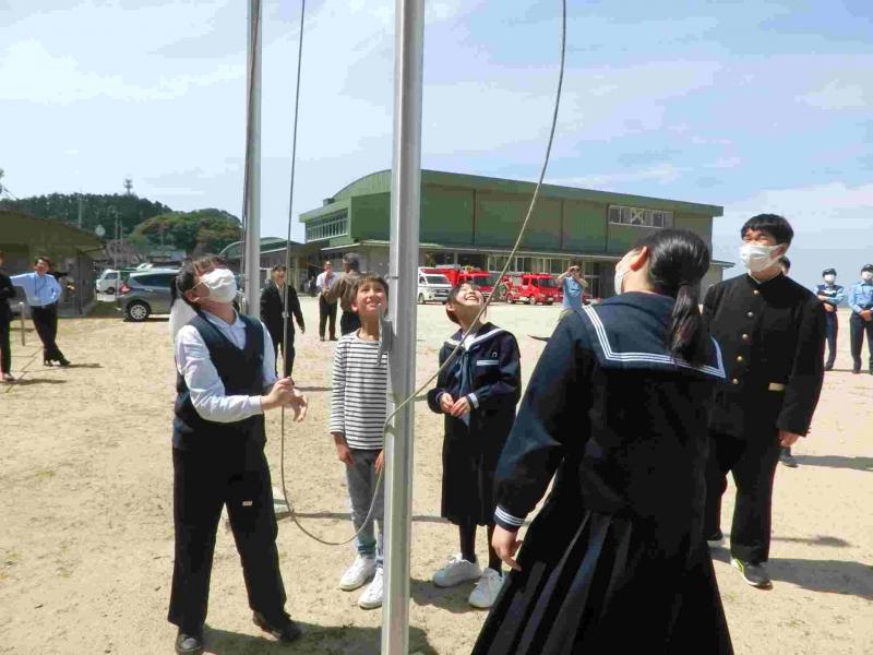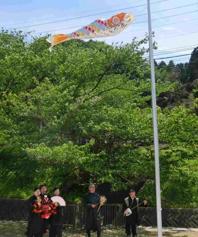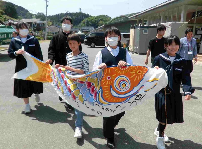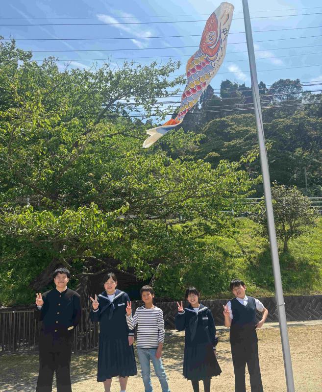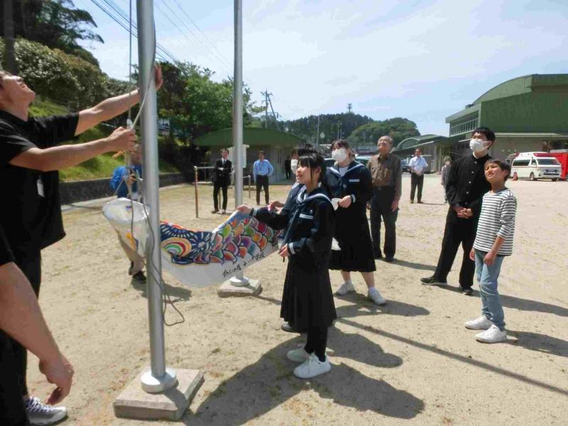 4月から取り組んでいた鯉のぼりが完成しました。晴れ渡った空、初めて自分たちで作った鯉のぼりを上げました。地域の方々が見守る中、ボランティアで演奏に来られていた方々に『こいのぼり』の曲を演奏してもらい、いよいよ上がっていく鯉のぼり!大丈夫かなと心配しましたが、元気に泳ぎました。「今年は断念したけれど、来年は鯉のぼりフェスティバルやりたいな」という地域の方の声もありました。地域を元気にするプロジェクト第1弾は大成功でした。