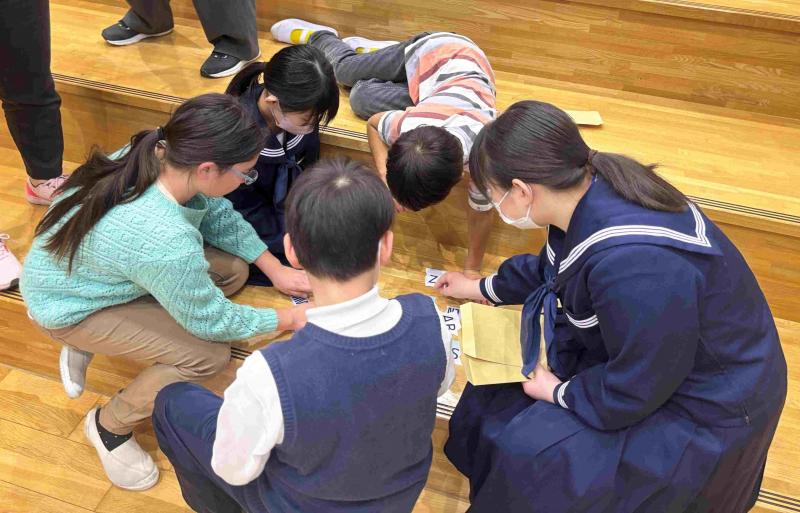 児童生徒会長考案のミニリクリエーションが開催されました。今日のレクは、宝探しゲームでした。児童生徒と先生方で誕生日の近い人とペアを組んで隠されている宝(封筒)を必死になって探しました。意外と難しく、なかなか見つからない中、ヒントを頼りにすべての宝を探し当てることができました。最後に封筒の中を開けると何やら文字が・・・。パズルのようになっていて合わせるとドイツ語で「大谷へようこそ!一緒に楽しい時間を過ごしましょう!」というメッセージになりました。これは、昨年度ドイツから来て、本校で2か月ほど学んだ児童が、昨日から再び訪れていることにより、歓迎のメッセージを伝えたものでした。ちょっと洒落たメッセージにみんなから大きな拍手が沸き起こりました。