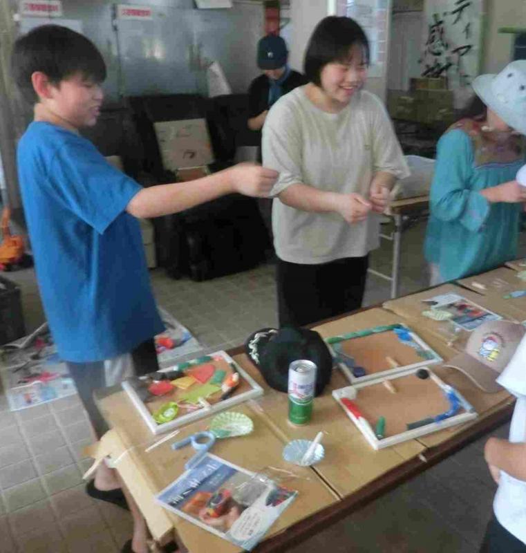 毎年、PTA親子行事では、揚げ浜塩田の塩づくり体験をしていますが、今年度は地震の影響で体験ができませんでした。そこで、地域の環境を守る活動として、馬緤海岸のゴミ拾いボランティアと海ゴミを使ったアートづくりを行いました。その後祭りばやしの演奏やスイカ割りをして楽しみました。久しぶりに会った大谷の仲間と共にする活動はとても楽しかったですね。
