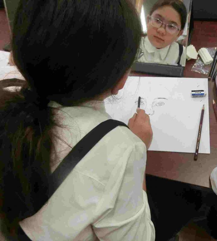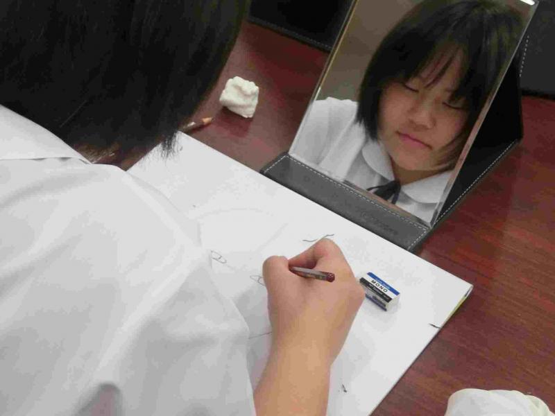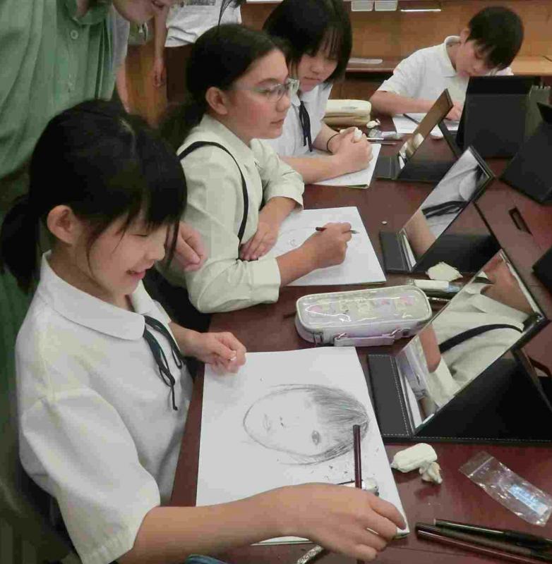登校日の今日は、最初に自画像教室を行いました。福井崇人先生と青山きえ先生に来ていただき、自分の顔をじっくりと観察することで言葉にできない自分の気持ちを知る学習を行いました。先生方には、様々なアドバイスをいただきました。また、鏡や様々な画材、スケッチブックなどを用意していただきました。金沢大学の学生の方がボランティアとして来てくださり、アシスタントをしてくださいました。みんなが真剣に自分と向き合い、じっくりと自分を観察し、絵にする、とても良い時間を過ごすことができました。