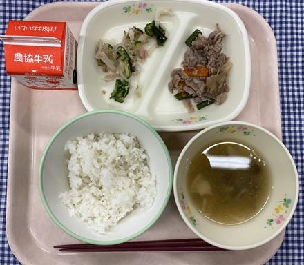 今日の給食献立は、白ごはん・豚肉ときのこの炒め煮・大根の和風サラダ・なめこのみそ汁・牛乳でした。