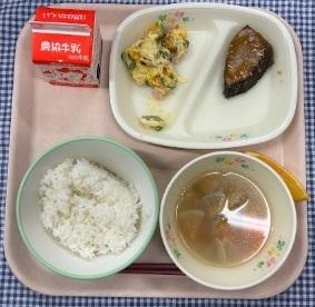 今日の給食献立は、白ごはん・ぶりの甘みそがけ・珠洲産かぼちゃのサラダ・珠洲産干ししいたけのみそ汁・オレンジ・牛乳でした。