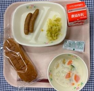 今日の給食献立は、コッペパン・ウィンナー・キャベツのカレーソテー・ホワイトシチュー・ケチャップ・牛乳でした。