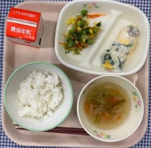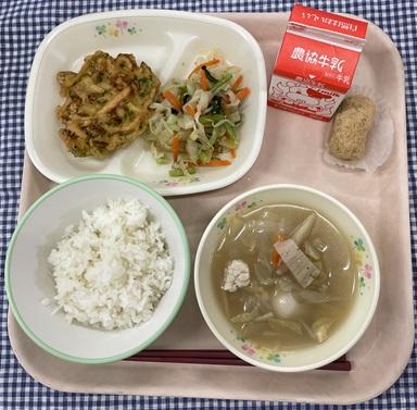 今日の給食献立は、白ごはん・野菜かき揚げ・小松菜とキャベツのおひたし・けんちん汁・おはぎ・牛乳でした。
