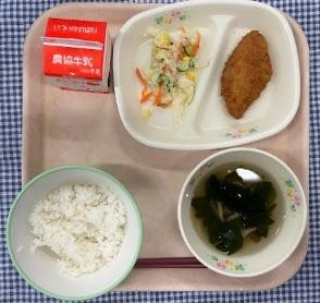 今日の給食献立は、白ごはん・ヒレカツ・ひじきのマヨサラダ・エリンギのコンソメスープ・牛乳でした。