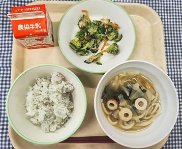 今日の給食献立は、ゆかりごはん・鶏ささみのさっぱりサラダ・五目うどん・牛乳でした。