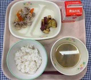 今日の給食献立は、白ごはん・肉野菜炒め・珠洲産さつまいもの大学芋・ごぼうとしめじのみそ汁・牛乳でした。