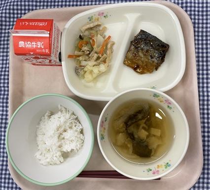 今日の給食献立は、白ごはん・サバのしょうが煮・キャベツの煮びたし・わかめとしめじのみそ汁・牛乳でした。