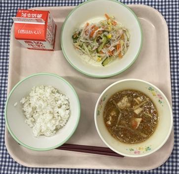 今日の給食献立は、白ごはん・春雨サラダ・マーボー豆腐・牛乳でした。