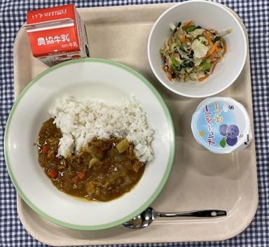 今日の給食献立は、麦ごはん・ポークビーンズカレー・小松菜とにんじんの和え物・ブルーベリーゼリー・牛乳でした。