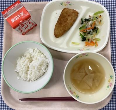今日の給食献立は、白ごはん・アジフライ・磯香和え・じゃがいもと大根のみそ汁・牛乳でした。