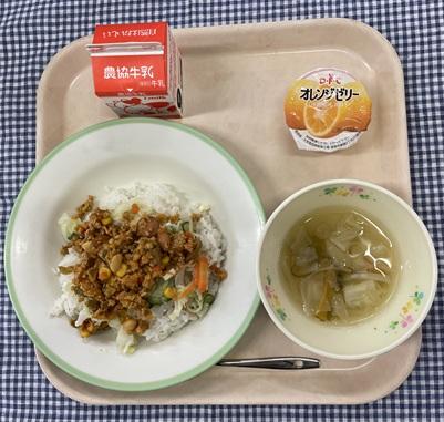 今日の給食献立は、タコライス・キャベツのコンソメスープ・みかんゼリー・牛乳でした。