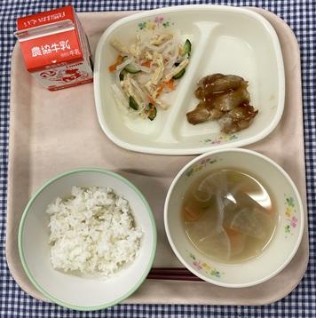 今日の給食献立は、白ごはん・鶏肉の照り焼き・紅白なます・のっぺい汁・牛乳でした。