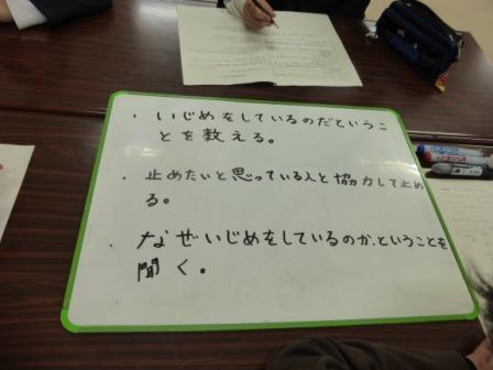 今までいじめについて深く考えたことがなかったけど、他校の取組を聞いたり、話し合ったりして、これからもいじめのない学校を保っていきたいと思った。高校へ行っても、いじめをせず、させず、見逃さずを目標にしたい。