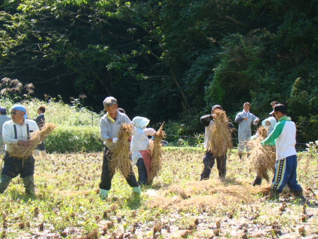 修学旅行帰りの3年生も加わり、恒例の黒米の稲刈りを行いました。多くの保護者の参加・協力を得て、マムシに遭遇することもなく無事に稲刈りを終了することができました。朝早くから現地にかけつけ稲刈りを行っていたT君のおばあちゃん、ありがとうございました。晴天の中、土にまみれての体験はなかなかできるものではありません。環境に感謝です。