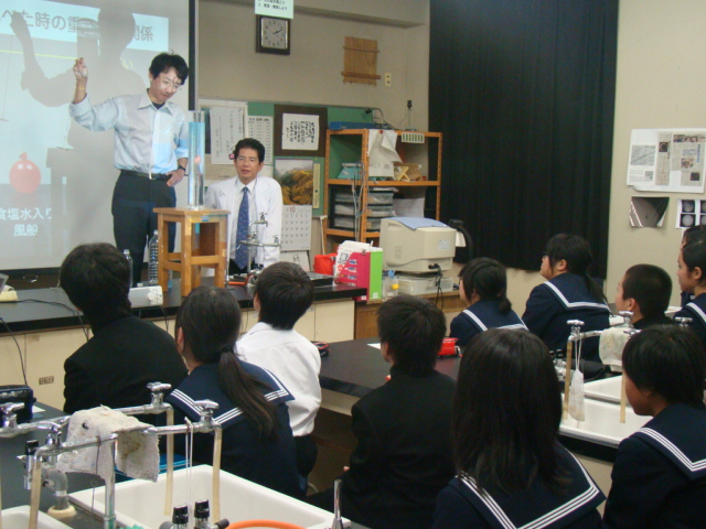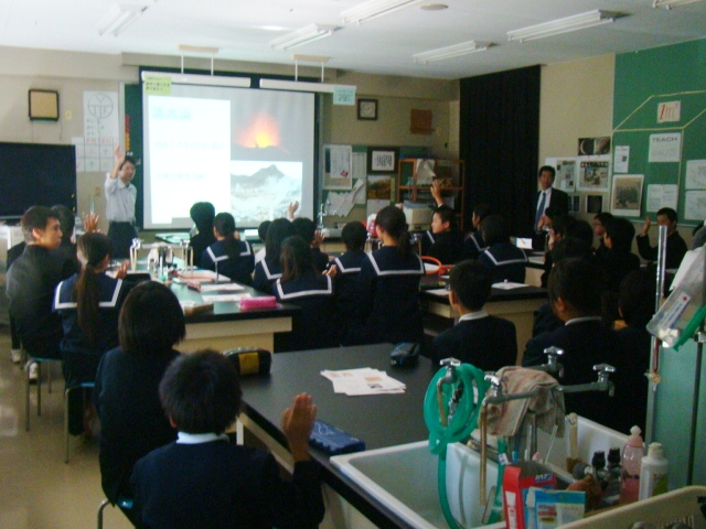 金沢大学の先生に来ていただいて、サイエンススクールを実施しました。せっかくの授業なので、小学校にも呼びかけて5,6年生にも参加してもらいました。内容は「火山」の噴火のメカニズムで実験や講義を通して、地中で起こる地球の不思議を学びました。