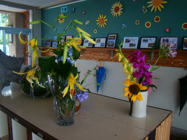 休日明けの朝、学校の玄関には自宅から持ってきた花が集まります。呼びかけに応じて、持ってきてくれる気持ちを思うと嬉しくなりますね。