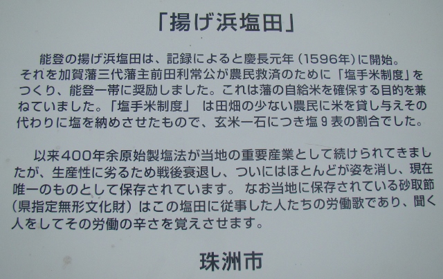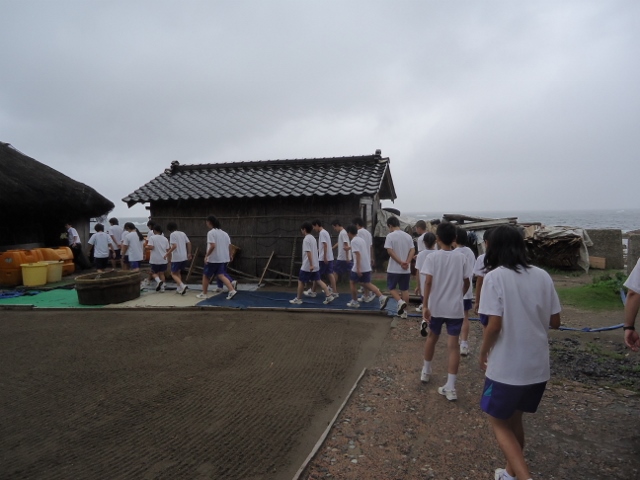 無形文化財 珠洲の揚げ浜塩田を受け継ぐ角花家を全校生徒で訪問し、塩作りのお話を聞くことができました。代々受け継がれた塩作りの歴史を5代目浜士、豊氏が語り、仁江の浜で作られたなめらかな塩を味わい、近くに存在する歴史ある伝統工法の一端に触れる事が出来ました。里山・里海はそこに人が介在します。揚げ浜塩田は、海からくみ上げた海水を山から切り出した木(薪)でくべて,塩を作ります。海(里海),人、山(里山)がクロスするまさに里山・里海の原点です。お世話して下さった6代目浜士、角花 洋氏に感謝いたします。貴重な体験をありがとうございました。