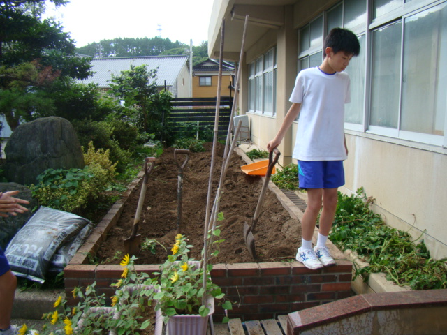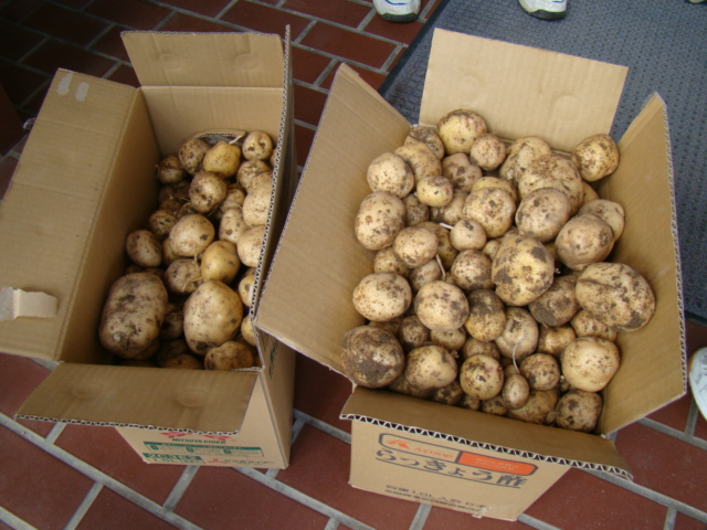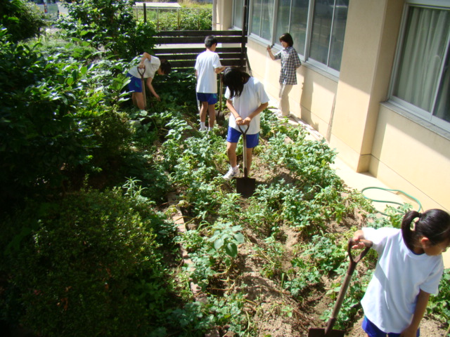 終業式が終わり通知表渡しの真っ最中、玄関前の菜園のジャガイモの収穫を行いました。収量は18Kg。2学期の給食にお目見えです。(左:収穫前 中:収穫したジャガイモ 右:収穫後)