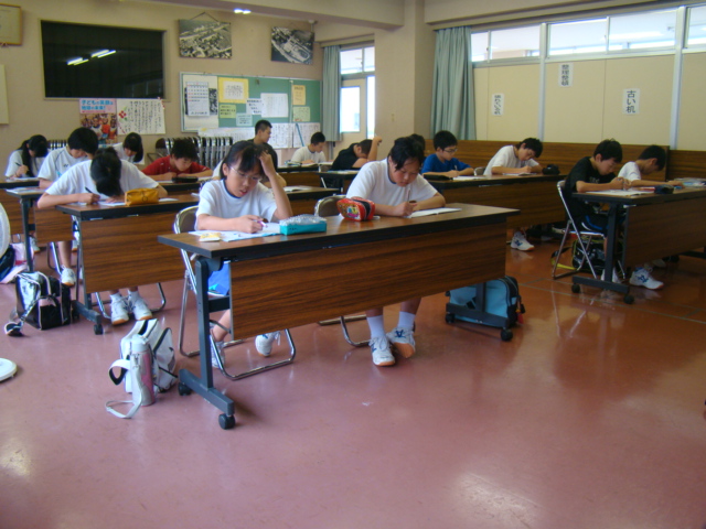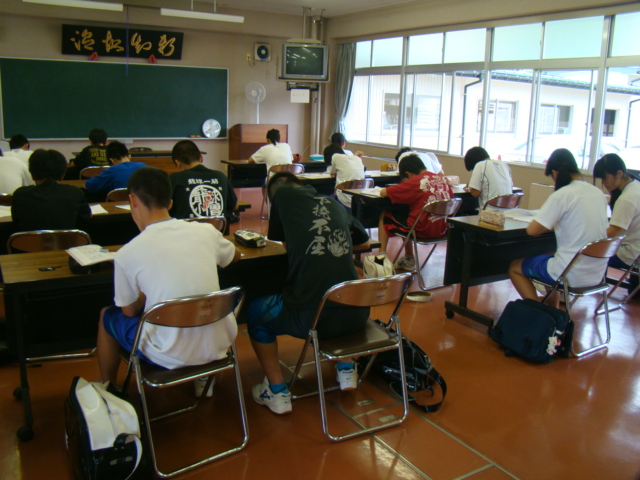 代わって、3年生達が補習です。9時から12時まで,今日のメニューは国・社・理です。夏を制する者は受験を制する!! 頑張れ大谷中健児。