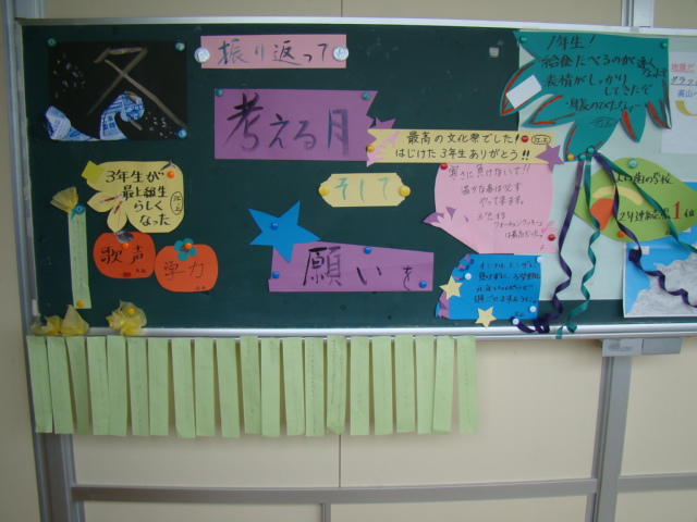 師走に入り各種テストが行われました。生徒達は総合の発表で放課後も作成作業に追われています。玄関にはクリスマスツリーが飾られています。1F廊下には今年を振り返っての掲示物があります。思い思いの気持ちが込められています。