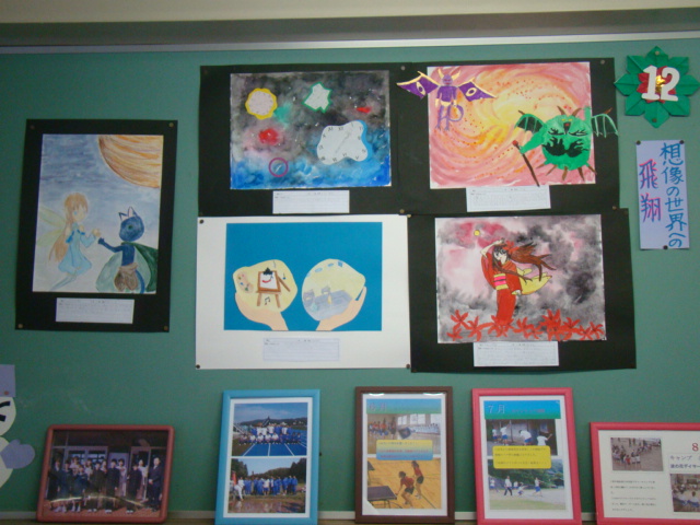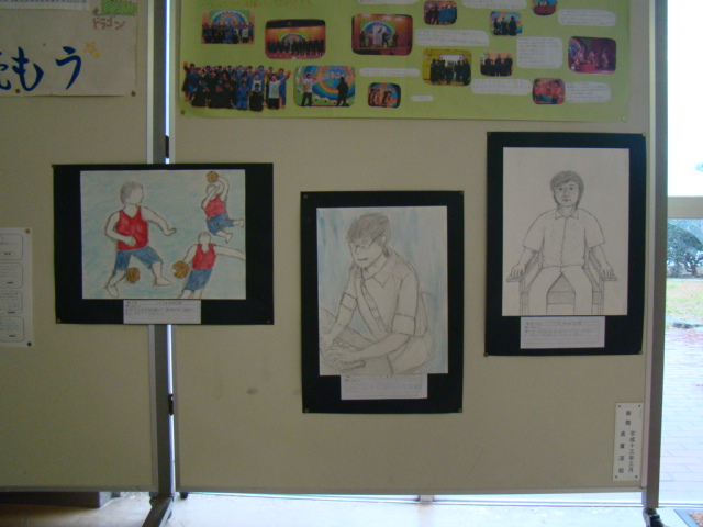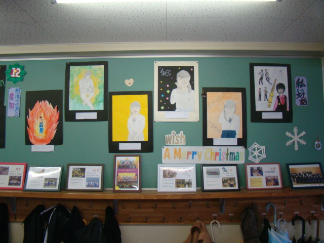 美術の作品が先週から掲示されています。今日、新たに作品が一新しました。誰の自画像かわかりますか?まだ、完成していない人もいるようです。(作品:2,3年自画像)