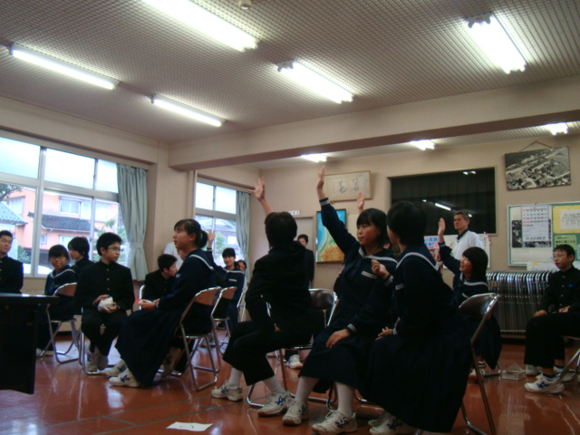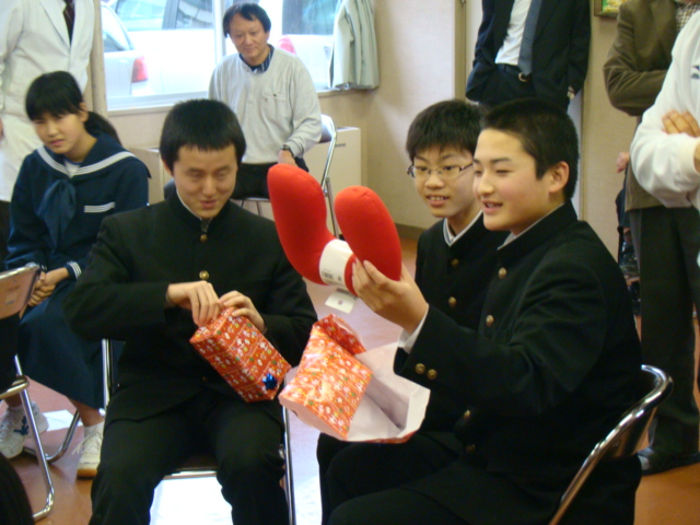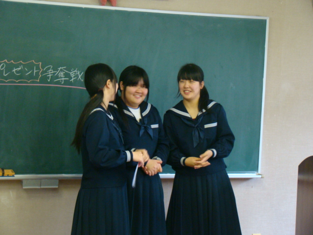 もうすぐクリスマスです。生徒会が企画したゲームで、お昼休みの時間ゲームで盛り上がりました。クイズに答えて、商品ゲット!!その場でお披露目をしました。先生方は参加資格が無く、残念そうです。明日は、スペリングコンテスト、校内バレーボール大会、そして総合的な学習発表会のリハーサル。先生ばかりではなく生徒も走り回る「師走」です。