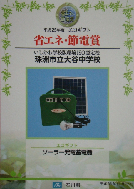 「省エネ・節電アクションプラン」取り組み強化期間(7~9月)において、電気使用量の削減に優れ(削減率昨年度比)かつ積極的な省エネ・節電への取り組み状況が認められ贈られました。