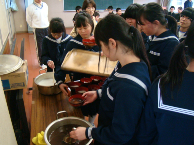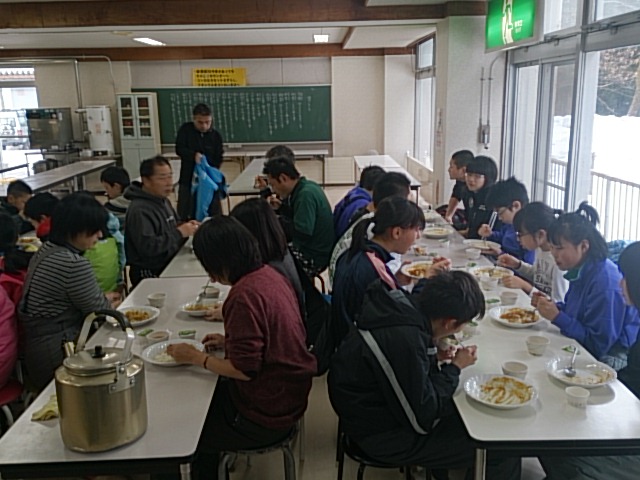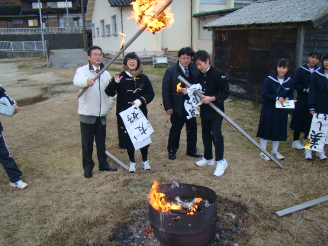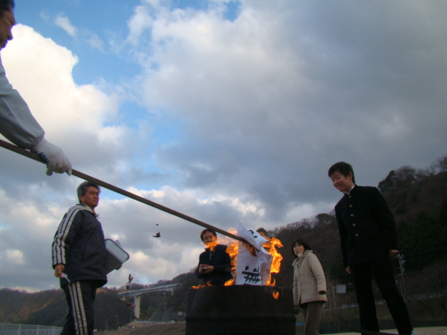 昨日の夕方、スキー体験学習から1,2年生達が無事、帰ってきました。事故もなく、充実したスキー実習ができたようです。疲れが少し残る中、生徒会が企画していた左義長を行いました。同時企画として各家庭から持ち寄った餅を使って、ぜんざいを作り全校で食べました。(数日前から準備していました。)スキーの疲れも吹っ飛んでいきます。天高く舞い上がった書き初めに願いを込めた1日でした。明日から2月、風邪に注意して、頑張ります。