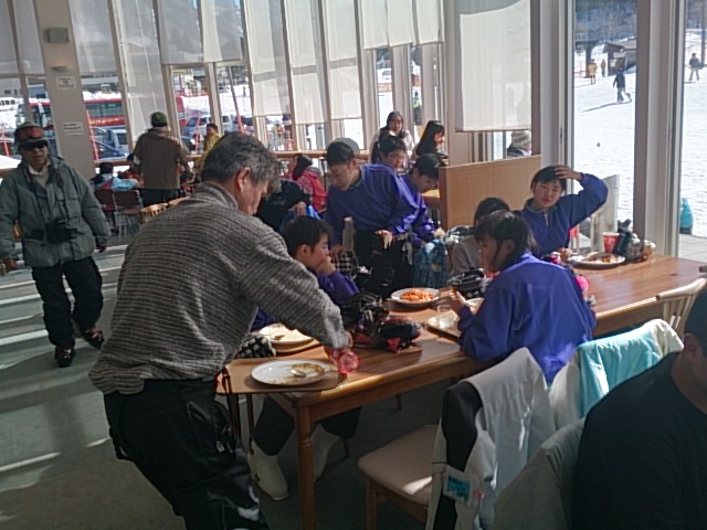 今日の日程を無事に終えたようです。快晴に恵まれ、どんな滑りができたでしょうか?お昼は、各自が好きなメニューで食べた様子です。