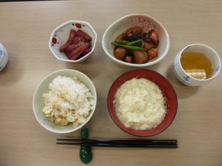 献立は栗ごはん、きのこのすりわり汁、いもだこ、やつがしらの酢の物、米粉の蒸しパンでした。