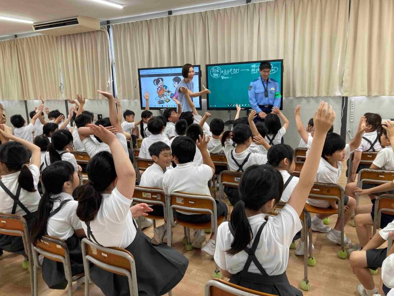プールでの消防と警察の訓練を見学したり、防災教室も4~6年生に実施したりしました。