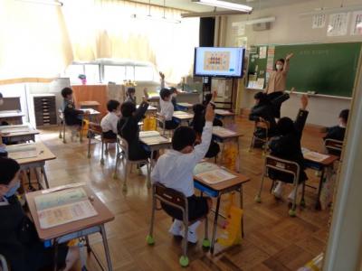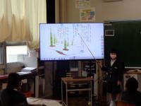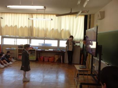 1年生がプレゼンテーションを使ってクイズをつくり、お互いで出し合っていました。機器の接続も自分たちでしていました。