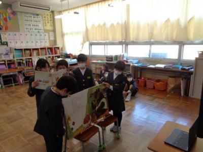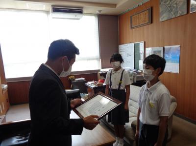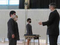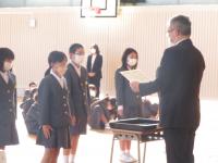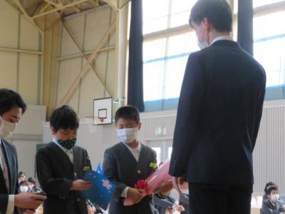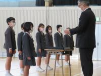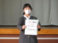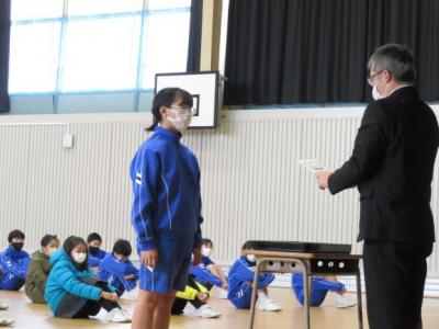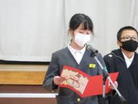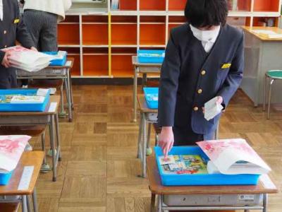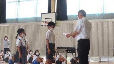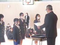 図書室から借りた本の累積冊数が多い児童を3人表彰しました。