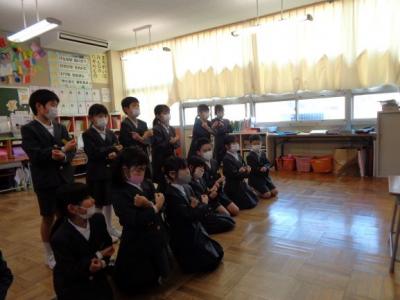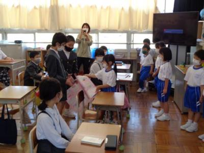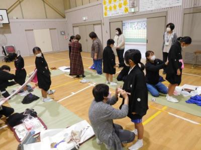 衣装の着付け教室がありました。4年生は初めて着てみました。