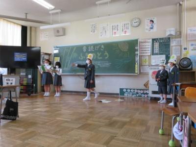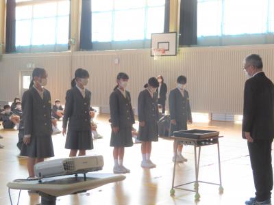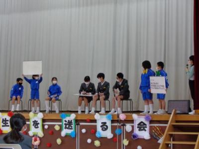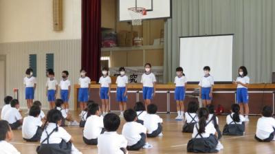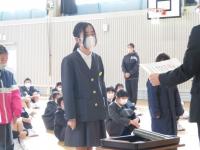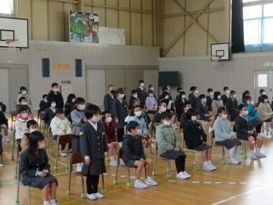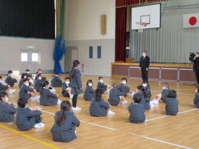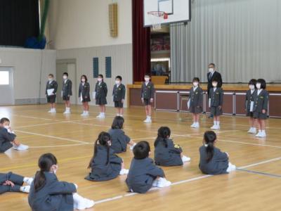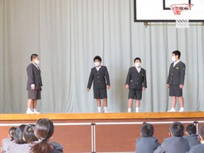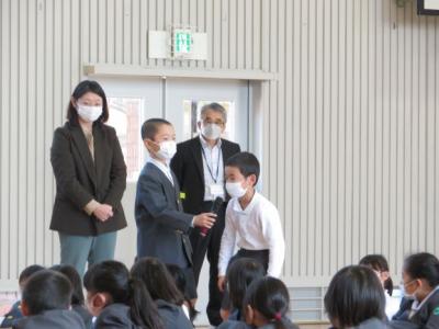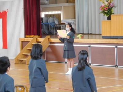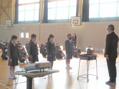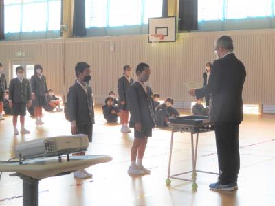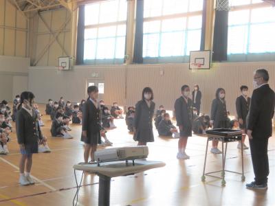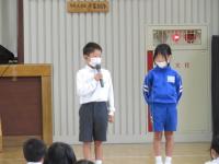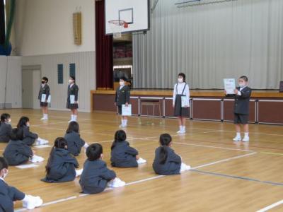 スポチャレいしかわの表彰、児童委員会のお知らせ、4年生の学年発表がありました。校長からは、送る会や卒業式で6年生をしっかり送り出すことと、相手の気持ちを考え、思いやりの気持ちを大切にして欲しいと話しました。