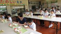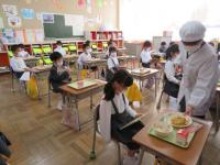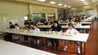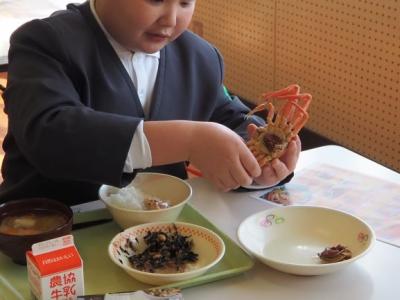 給食にカニが登場しました。加能ガニです。香箱といって雌のカニで内子外子おいしいですね。上手に食べました。