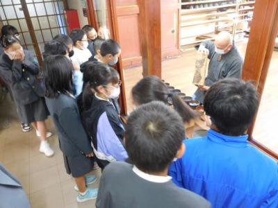 4年生が社会科と図工の学習で漆器工房を見学してきました。