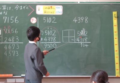 大屋小学校では、ひらめきボードを使い、児童が学習課題について自分の考えを持ち、自力で解決したり、友だちと学び合ったりしながら学習を深めていくことを目指しています。