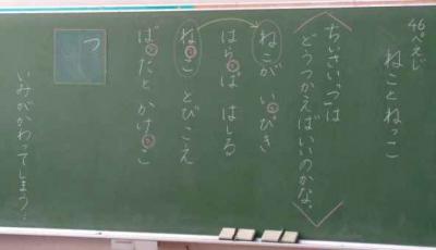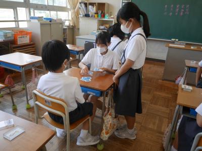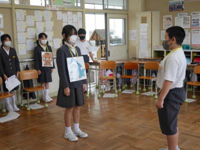 1年生が、国語科の教材を使って6年教室でクイズを出題しました。