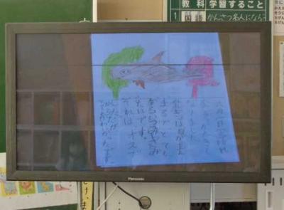 2年生が、実物投影機を使い調べたことを発表(プレゼンテーション)していました。自分のシートをそのまま拡大して説明しています。