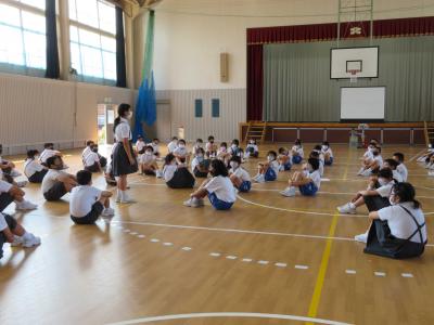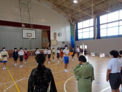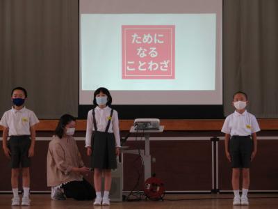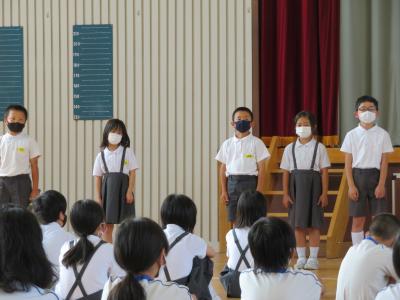 書き初め大会の表彰と英語を使った5年生の学年発表がありました。