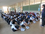 体育館に避難した後は、警察の方から「いかのおすし」や逃げ方などのお話があり、実際に1年生がやってみました。大事なことは、まずは大きな声を出して逃げることです。校長先生のお話の中で学年ごとに大きな声を出素練習もしてみました。